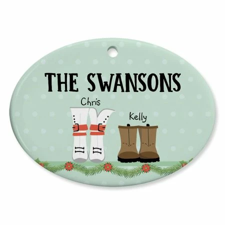 Have yourself a very merry Christmas! Jolly ceramic ornament displays your family as an array of boots. Hand-lettered with your personalization, and comes with hanging ribbons or strings. 2 1/4 x 3 1/2″H.