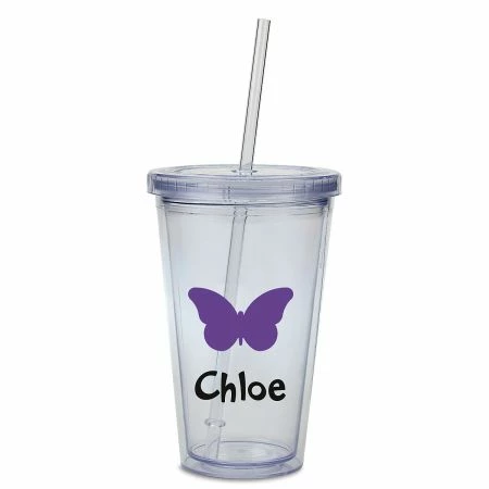 Double-wall acrylic cup is personalized—no mixups! Screw-on lid helps prevent spills; includes straw. Holds 16 oz., fits in most drink holders, and stands 6″H. BPA free. Hand wash is recommended, not dishwasher safe.
