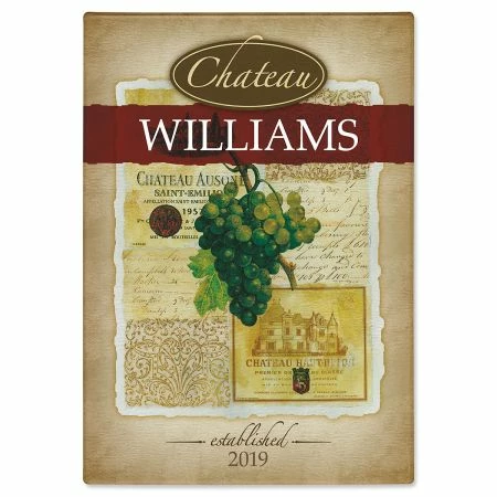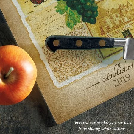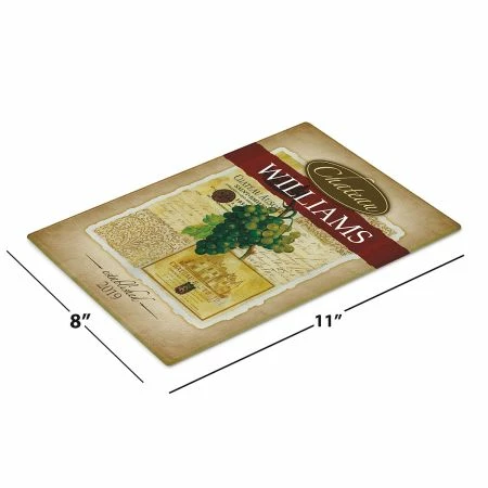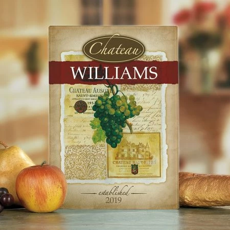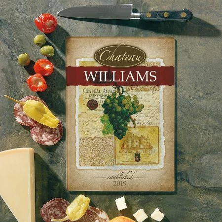 Our personalized tempered glass cutting board displays your name over a wine grapes motif.
