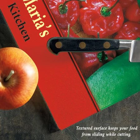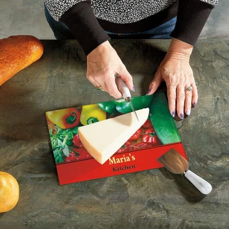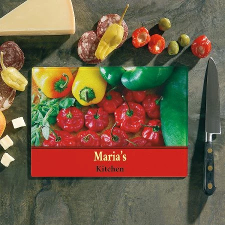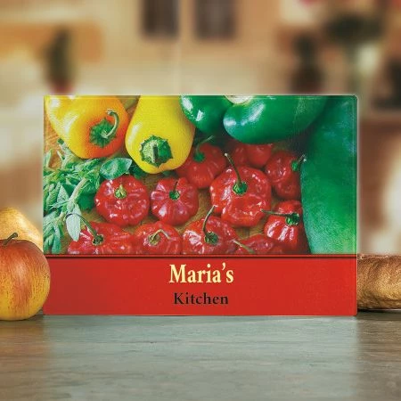 Our personalized tempered glass cutting board displays your name over a chili pepper motif.