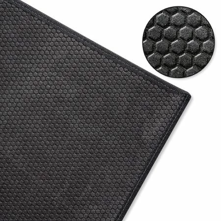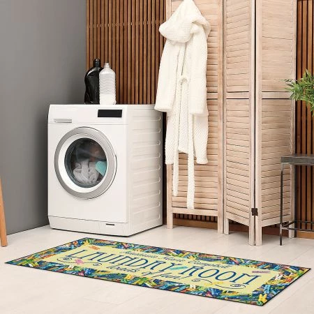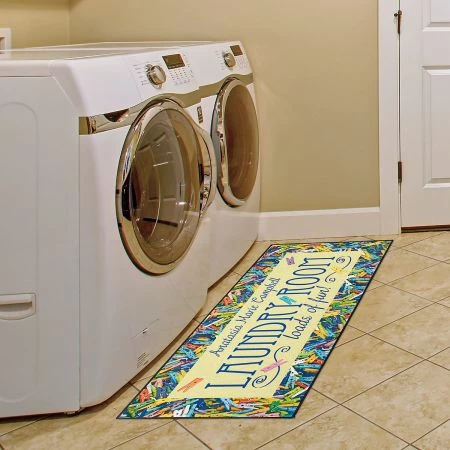 Large enough to fit in front of both washer and dryer, cushioning feet and protecting floor! Made of 100% polyester; 23 x 57″. Spot clean.