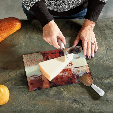 Add an inviting look to your kitchen or bar. Tempered glass board is shatter/heat/stain/odor/bacteria-resistant; 4 rubbery feet on bottom; not for microwave use. Hand wash. 7 3/4″ x 11″L.