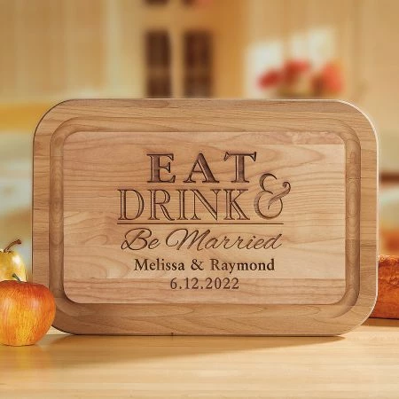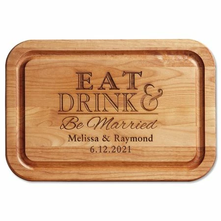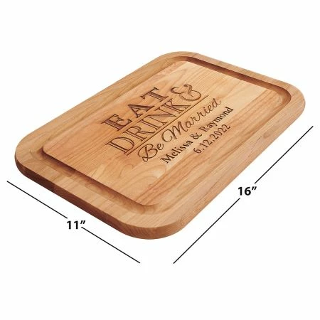 A fun way to recognize a marriage! Dual-side usage for both chopping and slicing, with a trench to catch the extras. Made in Oregon from solid red Alder, a sustainable American hardwood. 16 x 11 x 3/4″. Laser personalization.