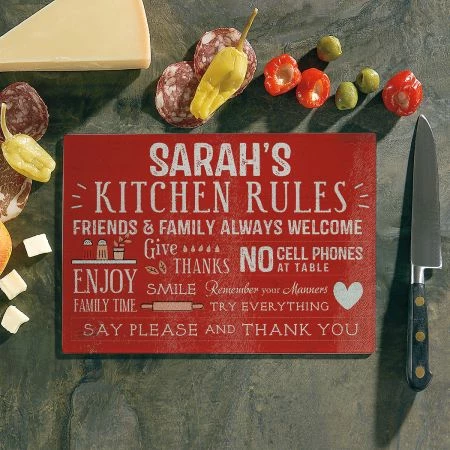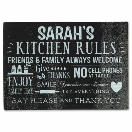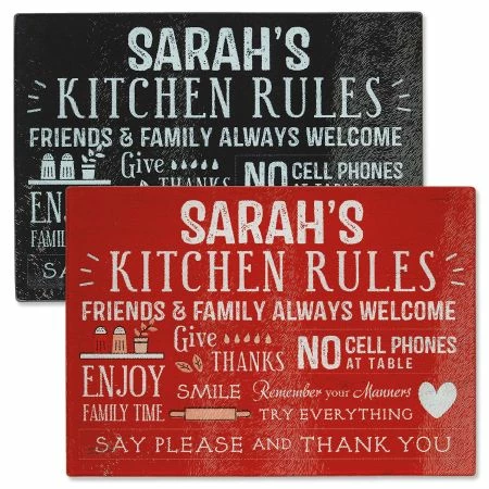 Tempered glass with 4 rubber bumpers to stabilize board’s movement. Measures approximately 11″W x 7 3/4″H. Hand washing recommended; not for microwave or dishwasher use.