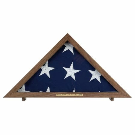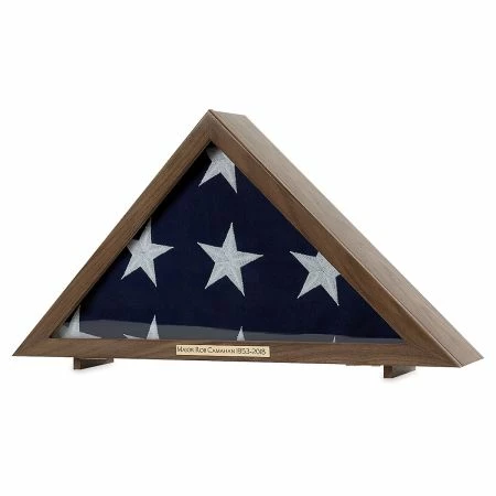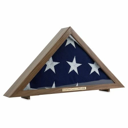 Fits the standard military memorial/burial flag. Walnut wood and plexiglass, 5 x 9 1/2”.