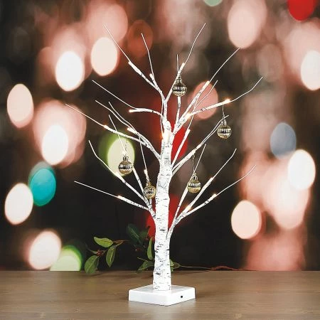 Charming little tree illuminates the room to spread holiday cheer and warmth with 24 LEDs. On/off switch, 3 AAA batteries not included. Plastic, steel wire. Approximately 15”T with base. Ornaments not included.