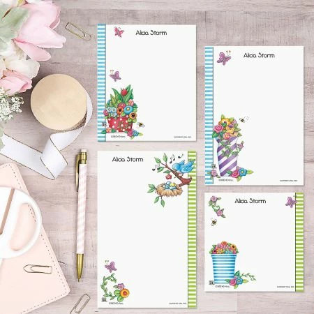 Imagine a world of beautiful flower gardens at your fingertips. Our Mary Engelbriet® personalized notepad sets are great for personal notes, short memos, grocery lists or taking with you while out and about for jotting down your contact information for new-found friends. Make great anytime gifts for friends and family but be sure to get a set for yourself. Personalized for you. Set of 4 sizes and designs, 100 sheets per pad, gift packaged.