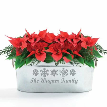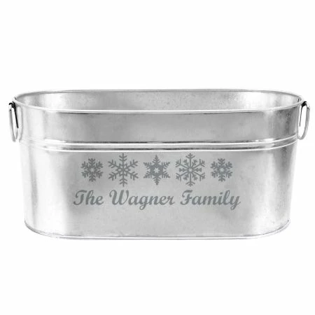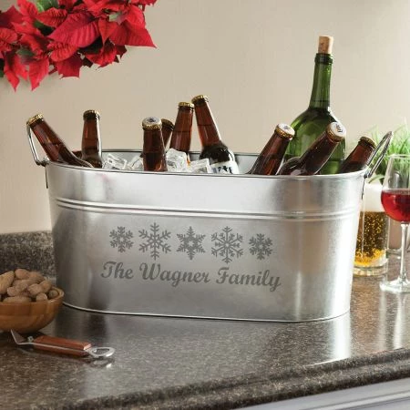 The perfect personalized addition for this holiday season! Perfect for holiday parties and family gatherings, our immobile, Personalized Snowflakes Beverage Tub is great to have around the holidays! This beverage tub is fantastic for storing drinks outdoors or indoors or for displaying flowers. Includes handles on each end for easy portability. Makes a great housewarming or Christmas gift.