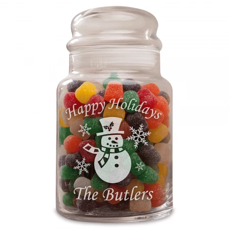 With “Happy Holidays” at the top, snowman jar has enough space for 1 line of personalization below the design. Jar is 7″H and holds 27 oz.; contents not included.