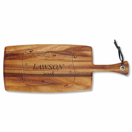Exclusive engraving on stunning acacia wood makes this versatile gift an enviable treasure. Leather hanger; 1/2 x 8 x 20 1/2″L.
