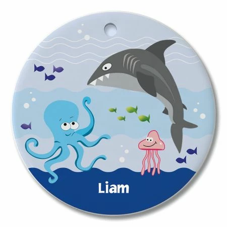 Ahh, the sea. Get your snorkeling gear…but let’s wait on the dock until the shark leaves! Still, there’s your own name on this small but expressive décor piece. Personalized ornament hangs in a window or pins to a bulletin board. Everyday ceramic ornaments are fun for children, teens, and adults. This round ornament: