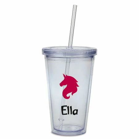 Double-wall acrylic cup is personalized—no mixups! Screw-on lid helps prevent spills; includes straw. Holds 16 oz., fits in most drink holders, and stands 6″H. BPA free. Hand wash is recommended, not dishwasher safe.