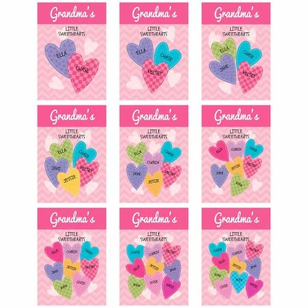 Specify top name up to 12 characters. 2-10 hearts with names up to 10 characters each (” Little Sweethearts” is pre-printed).