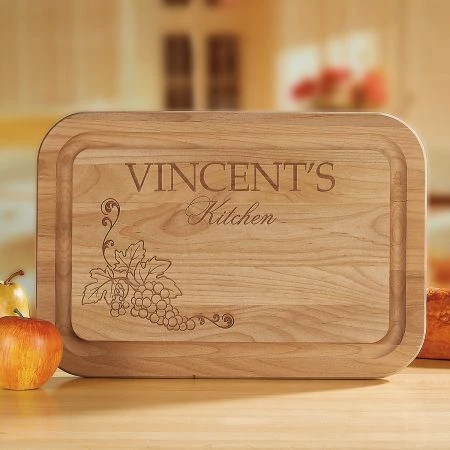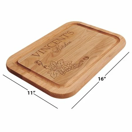 Naturally lustrous and eco-friendly! Crafted of sustainable bacteria-resistant hardwood, 11″ x 16″ wide cutting board will not nick or dull your cutlery and, trench border catches juices as meat is carved. Pretty design combines with your etched name to create a unique piece for your kitchen; makes an impressive gift, too. Wash with warm soapy water, dry immediately. Not dishwasher or microwave safe. Proudly made in the USA.